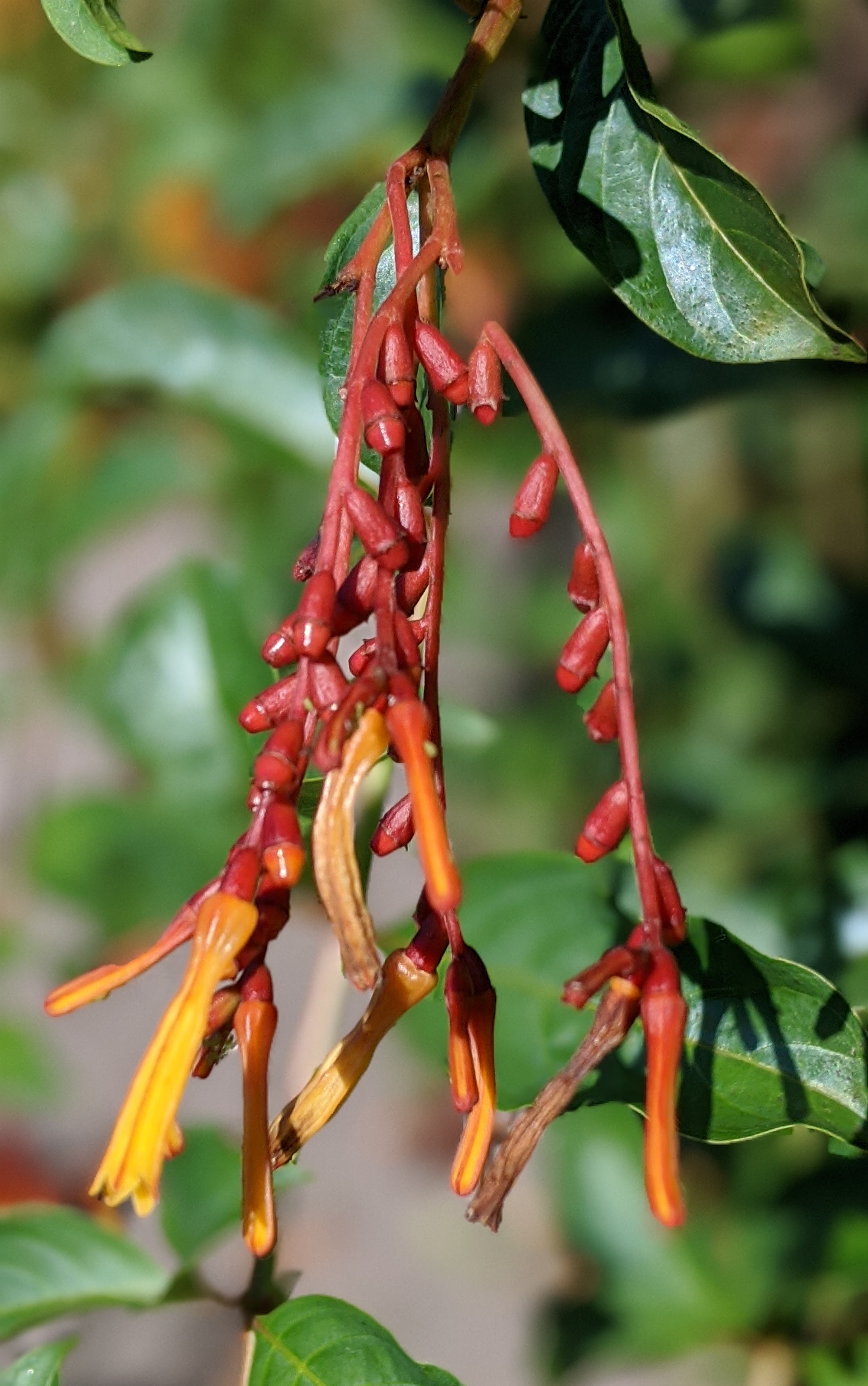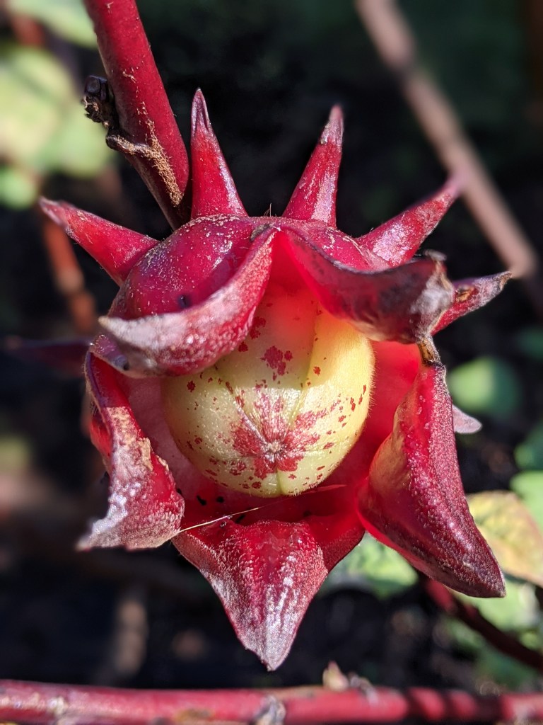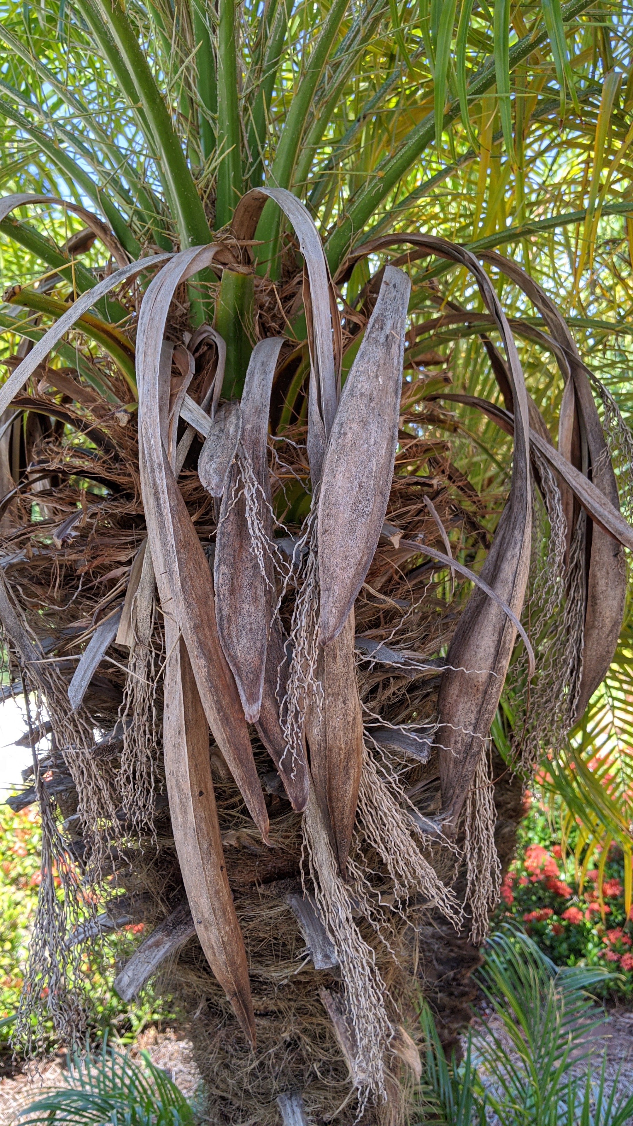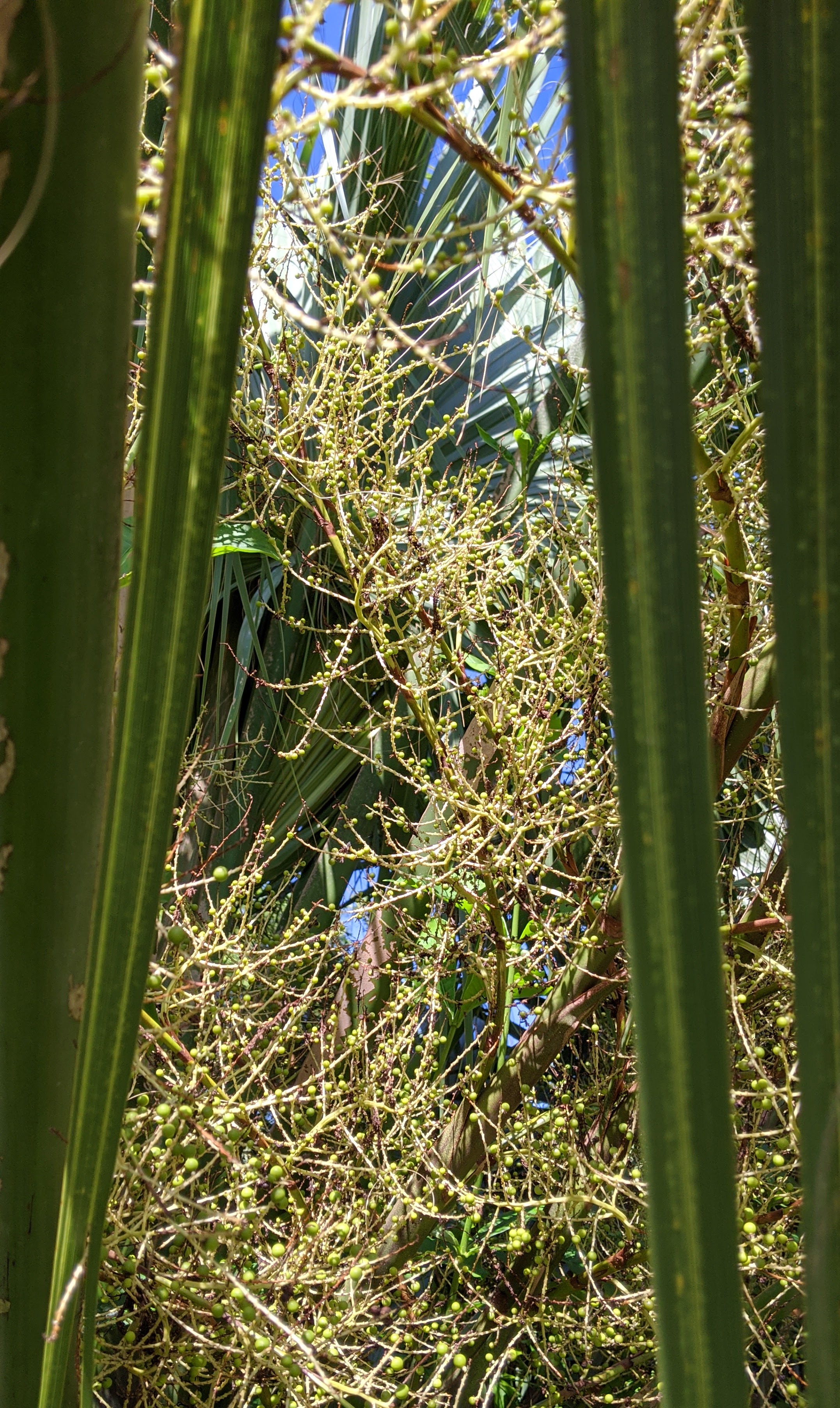 The top of the vase. The grey paddles are Flapjack Kalanchoe (Kalanchoe thyrsiflora) flowers. I have had Flapjacks around for so many years I am not sure of their origin. They grow in containers around my garden. I move them around – so easy to grow here. Green and red berries are from the Adonidia or Christmas Palm (Adonidia veitchii); another favorite of mine. This palm was grown from seed by a friend from Landscape Architecture school, Eddie, he gave me a palm seedling in 2013. The seedling is now 14 feet tall.