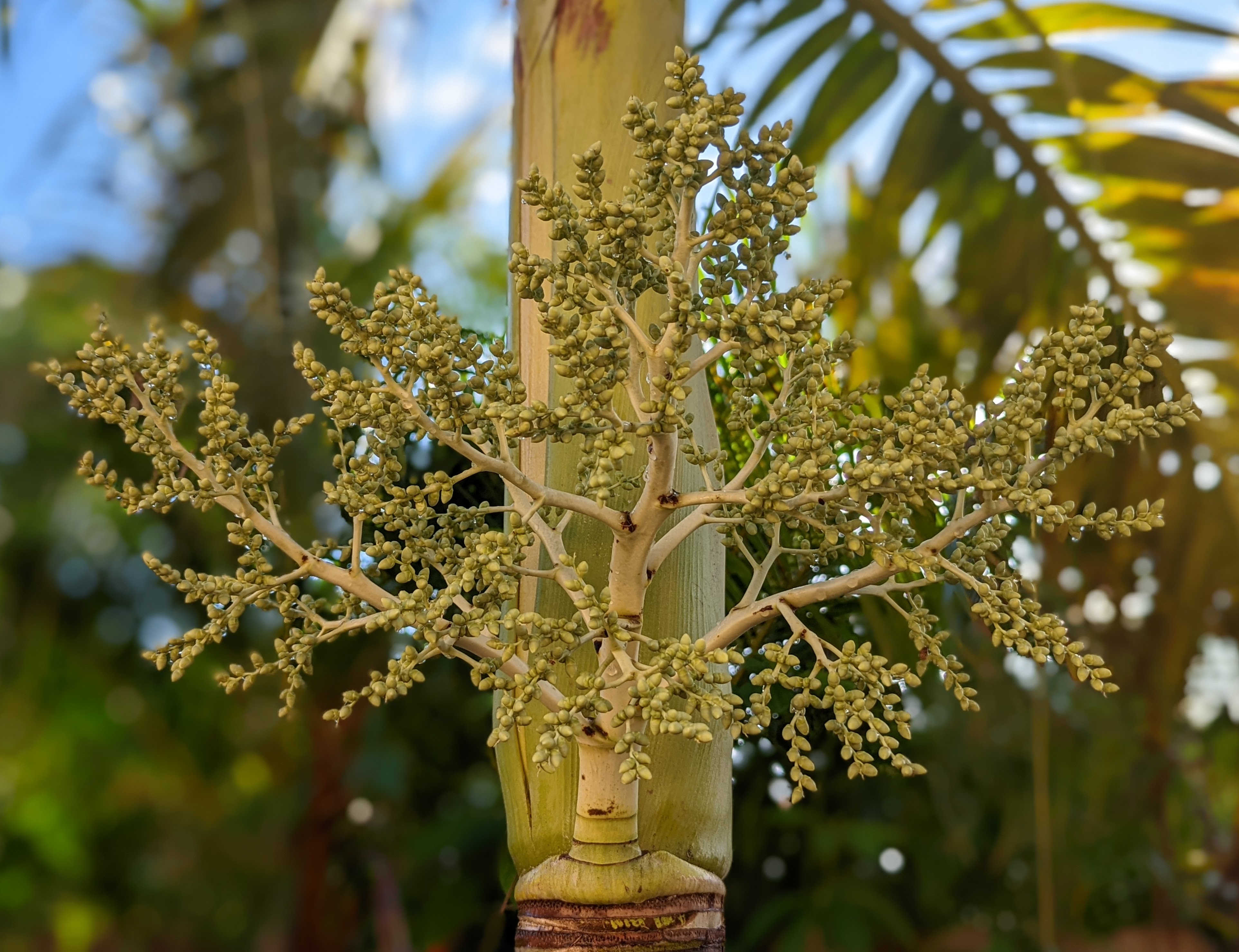 This is a Spinach Tree, also called Chaya (Cnidoscolus aconitifolius) A tree full of spinach! Only in South Florida. Actually, it is from Mexico and a tropical vegetable. It is poisonous unless you know how to cook it. I am told it tastes like spinach and reacts badly (toxic badly) with copper bottomed pans (like I use) so I have never tried it. I planted it for butterflies and they love the flowers.
