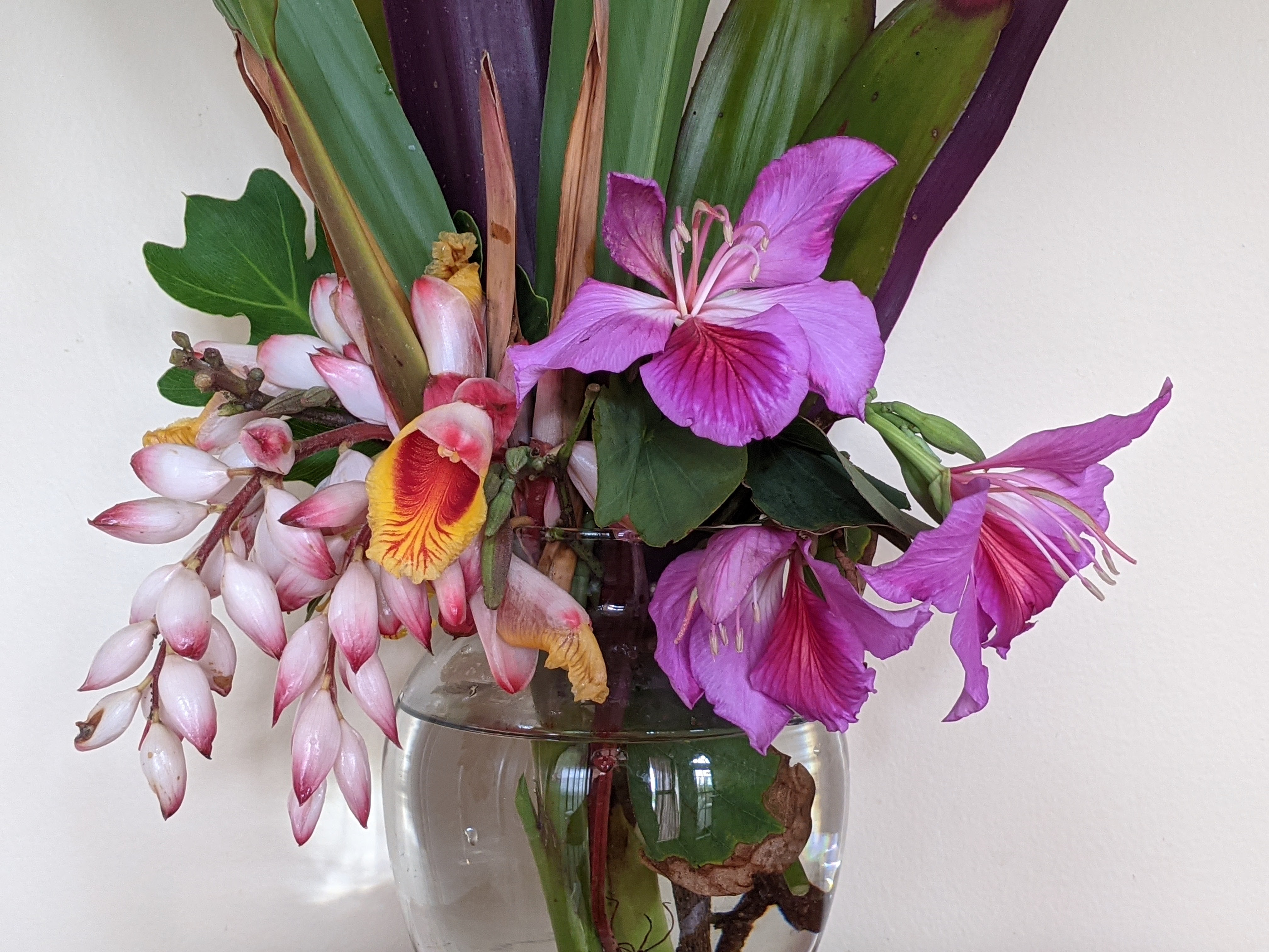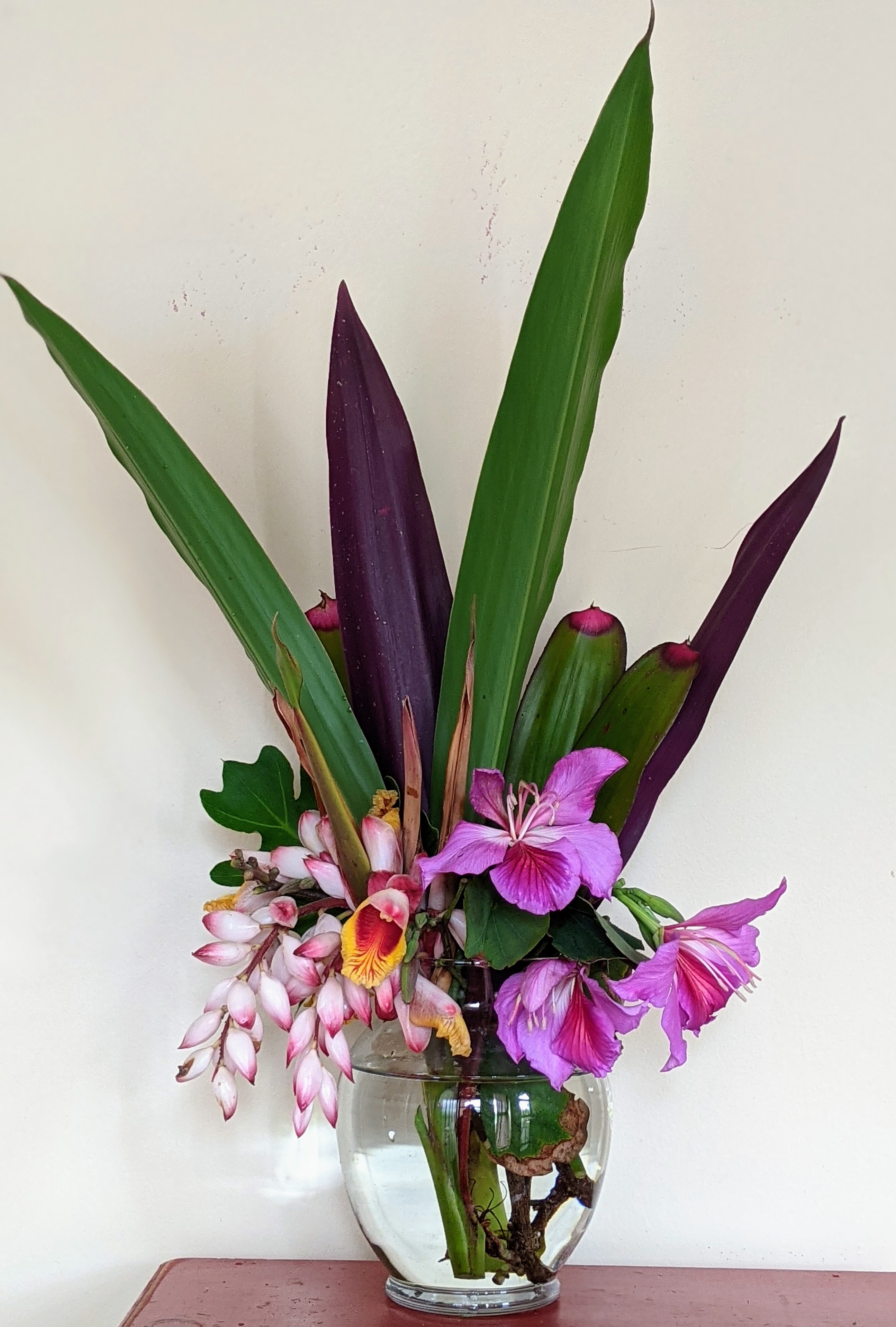 From time to time I make an arrangement that generates comments like ‘it belongs in the lobby of a spa’. I think there is a relaxation vibe from some of the more tropical plants in my garden. I have been gardening madly to get my pollinator/fruit garden finished before the rainy season starts, so I could use a Spa Day myself.