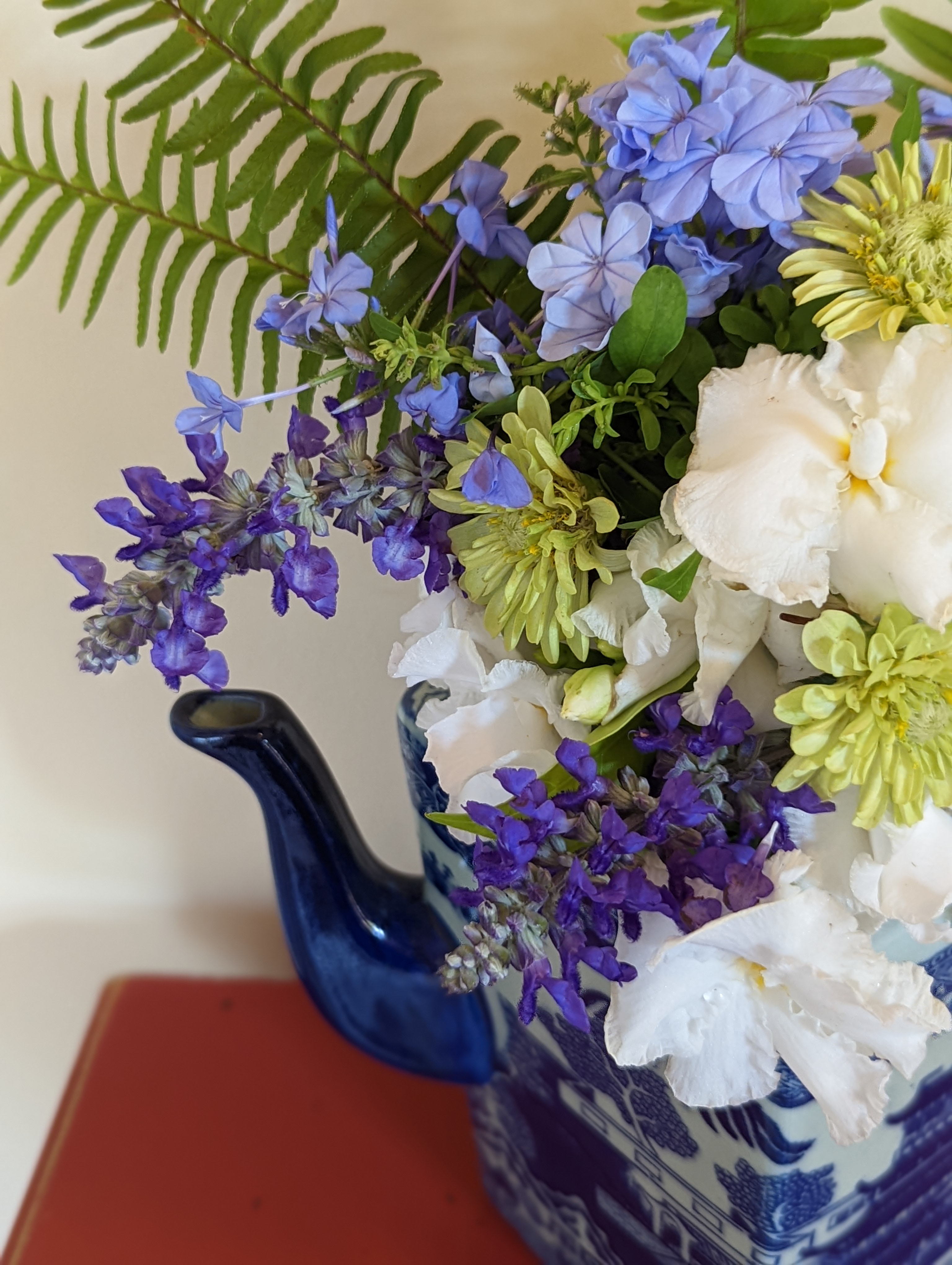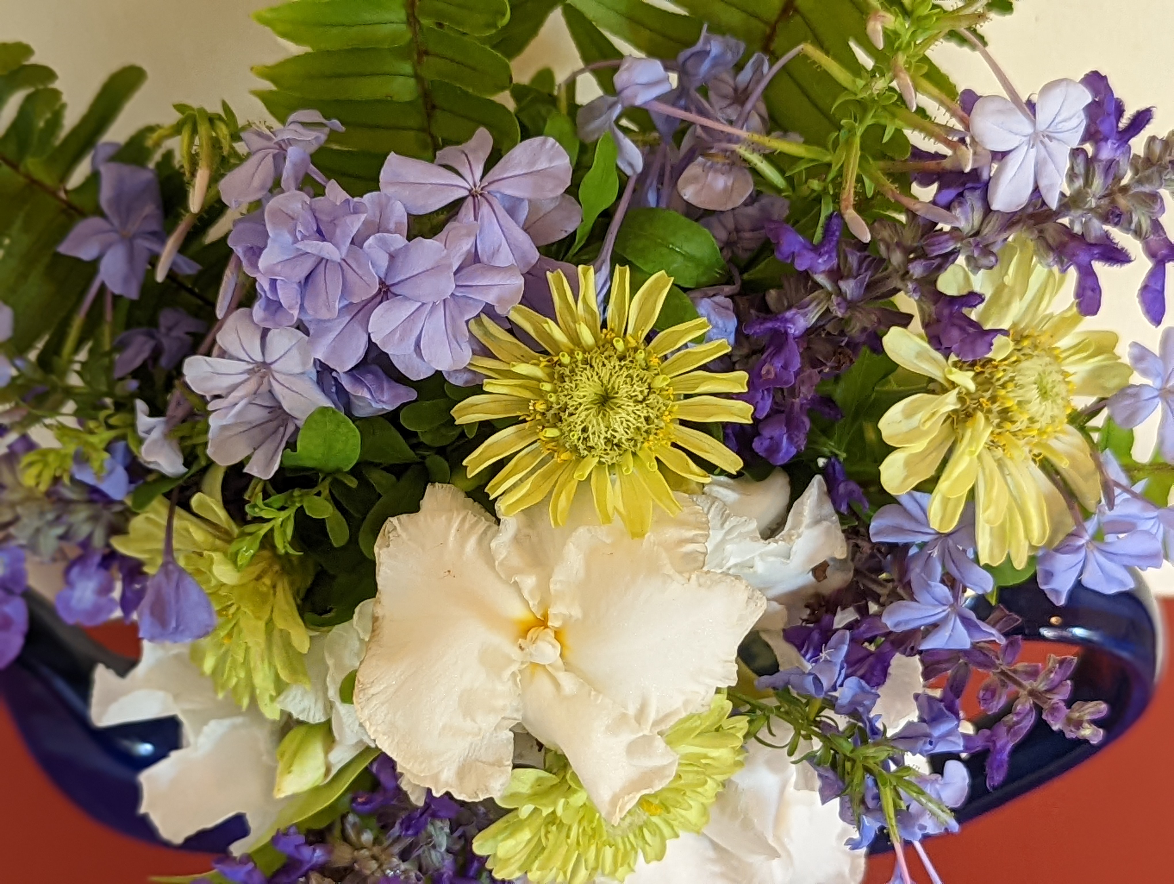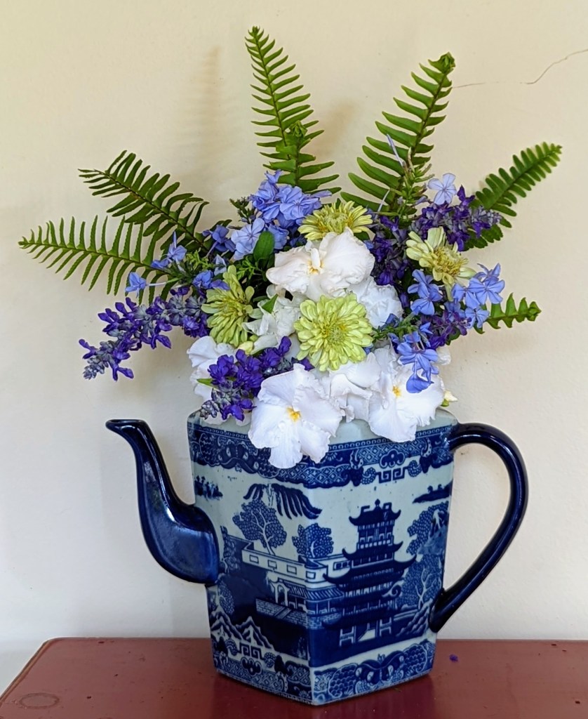 The fern in the vase is a Climbing Asparagus Fern (Asparagus africanus). These are invasive in Florida and I pull them when I find them and inevitably find another sooner or later. I enjoy using these in vases and recycling them that way. The plants have thorns so they usually find me.