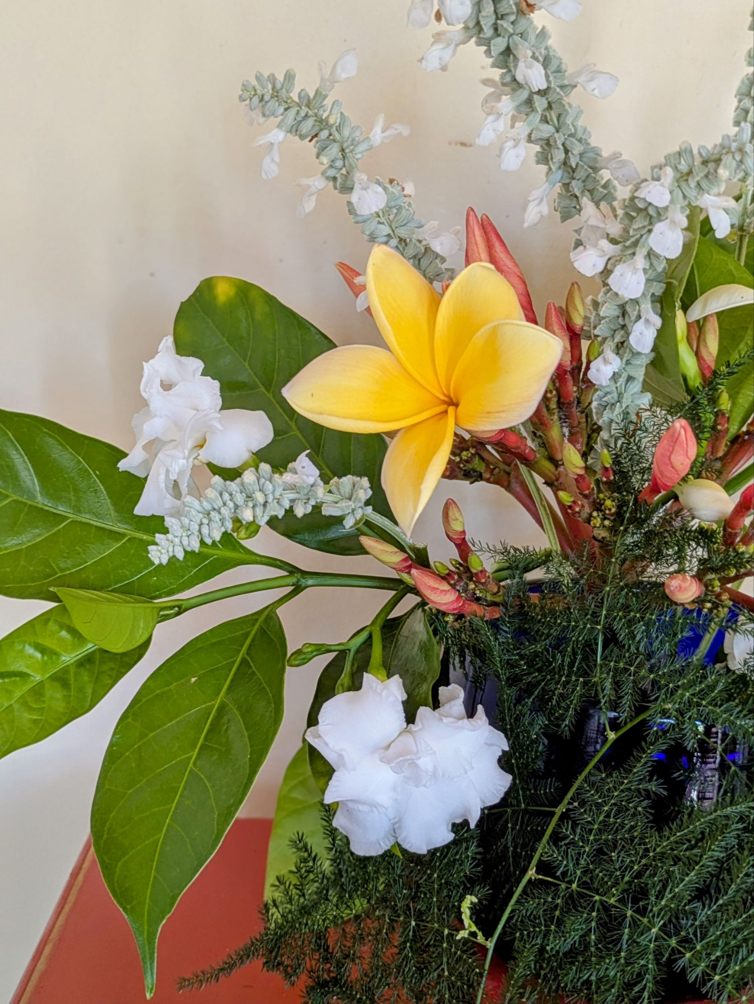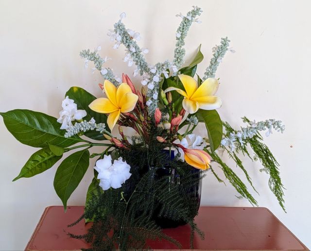 The fragrance from this combination would be worthy of a candle. The Tropical Gardenia (Tabernaemontana diviricata) has a much lighter scent than G. jasminoides. Combine that with the sweet yellow and pink Frangipani (Plumeria spp) and add a touch of the herbal tang of White Flame Salvia. I am really enjoying walking into my house and expect the scent to magnify this evening.