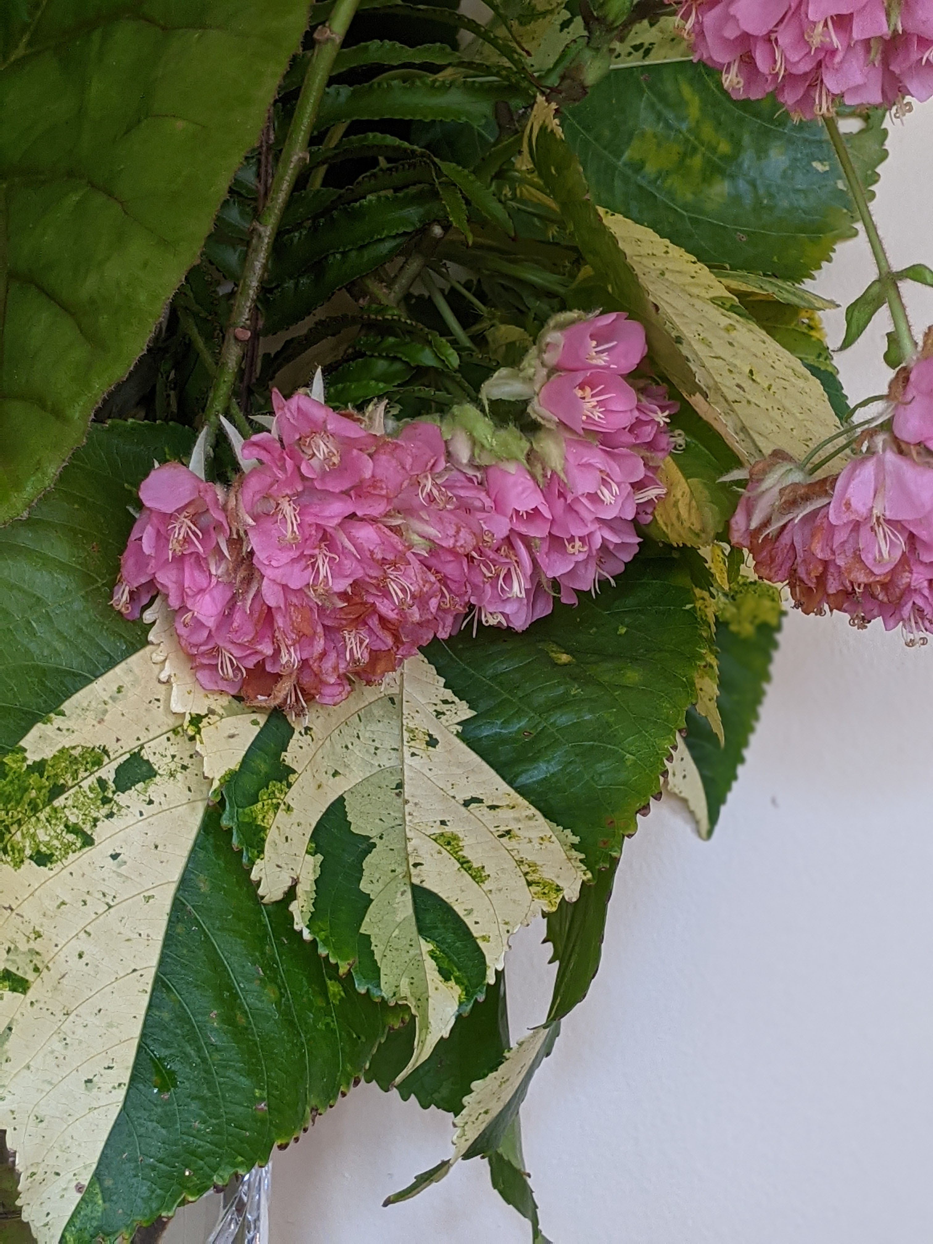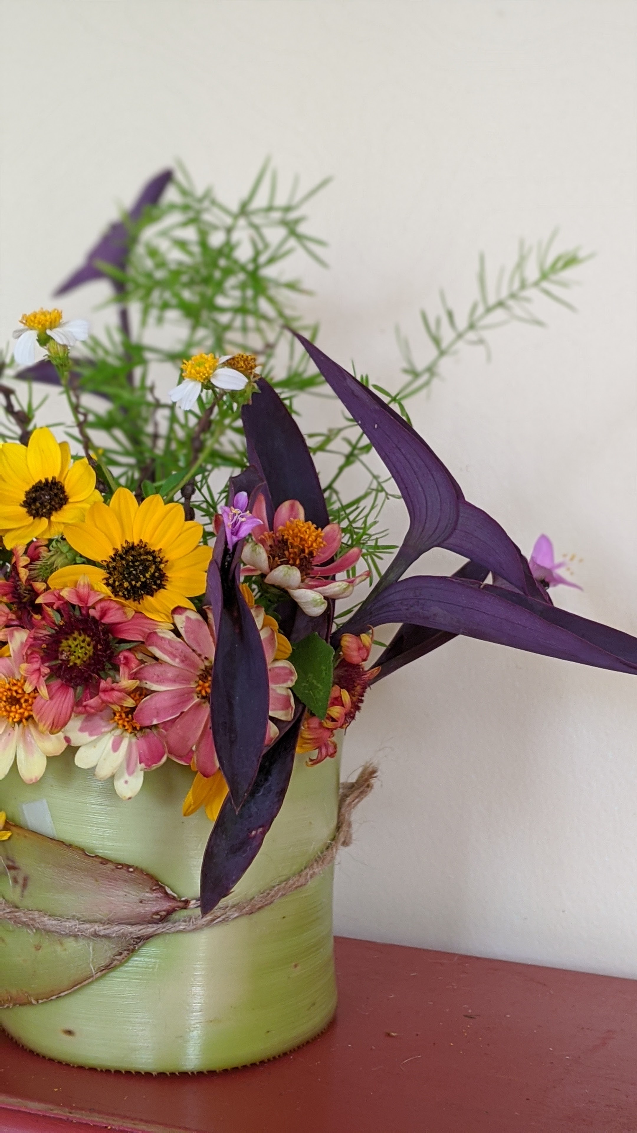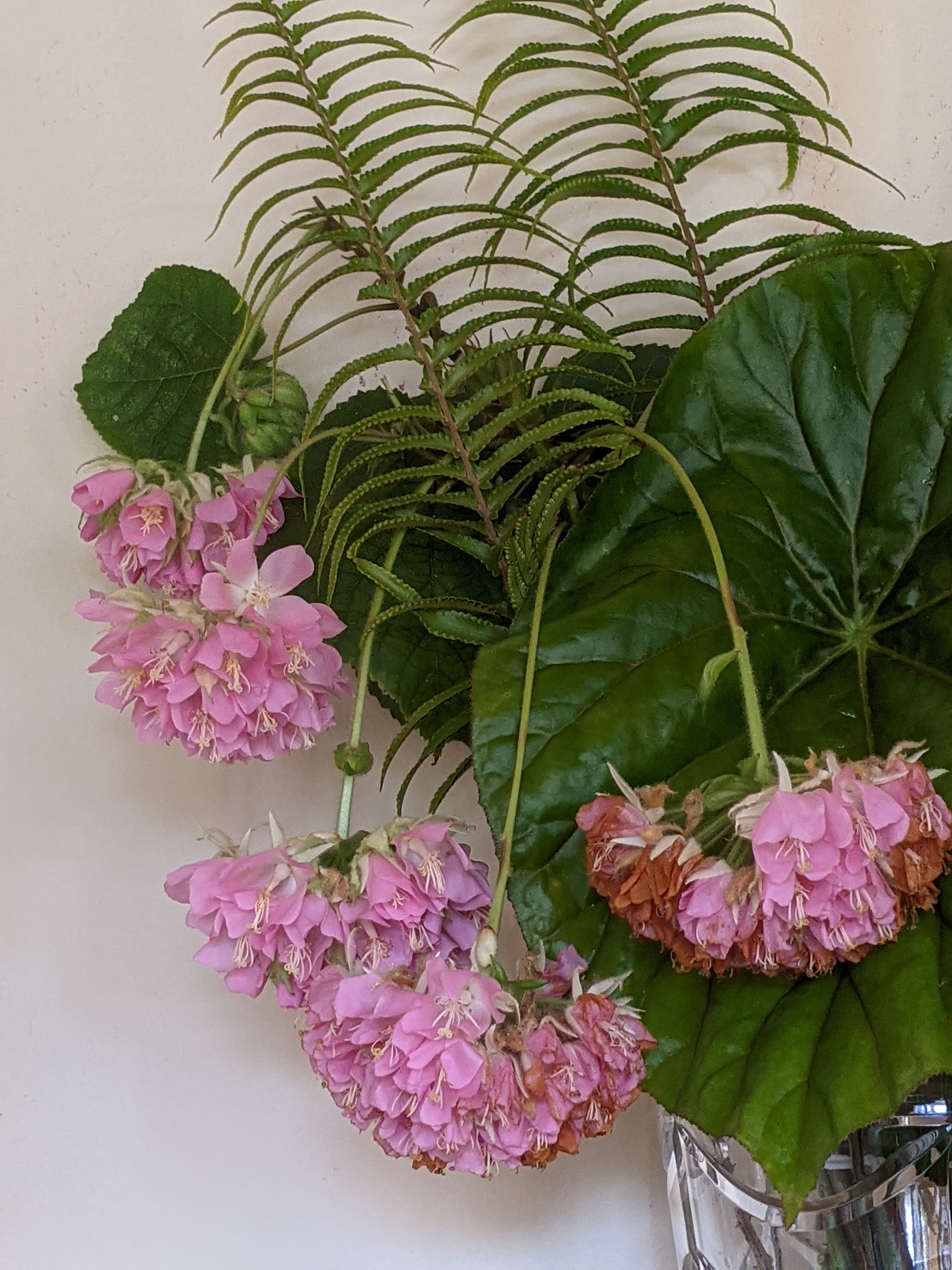 Red Nodding Hibiscus (Malvaviscus penduliflorus) are napping over the edge of the vase.
