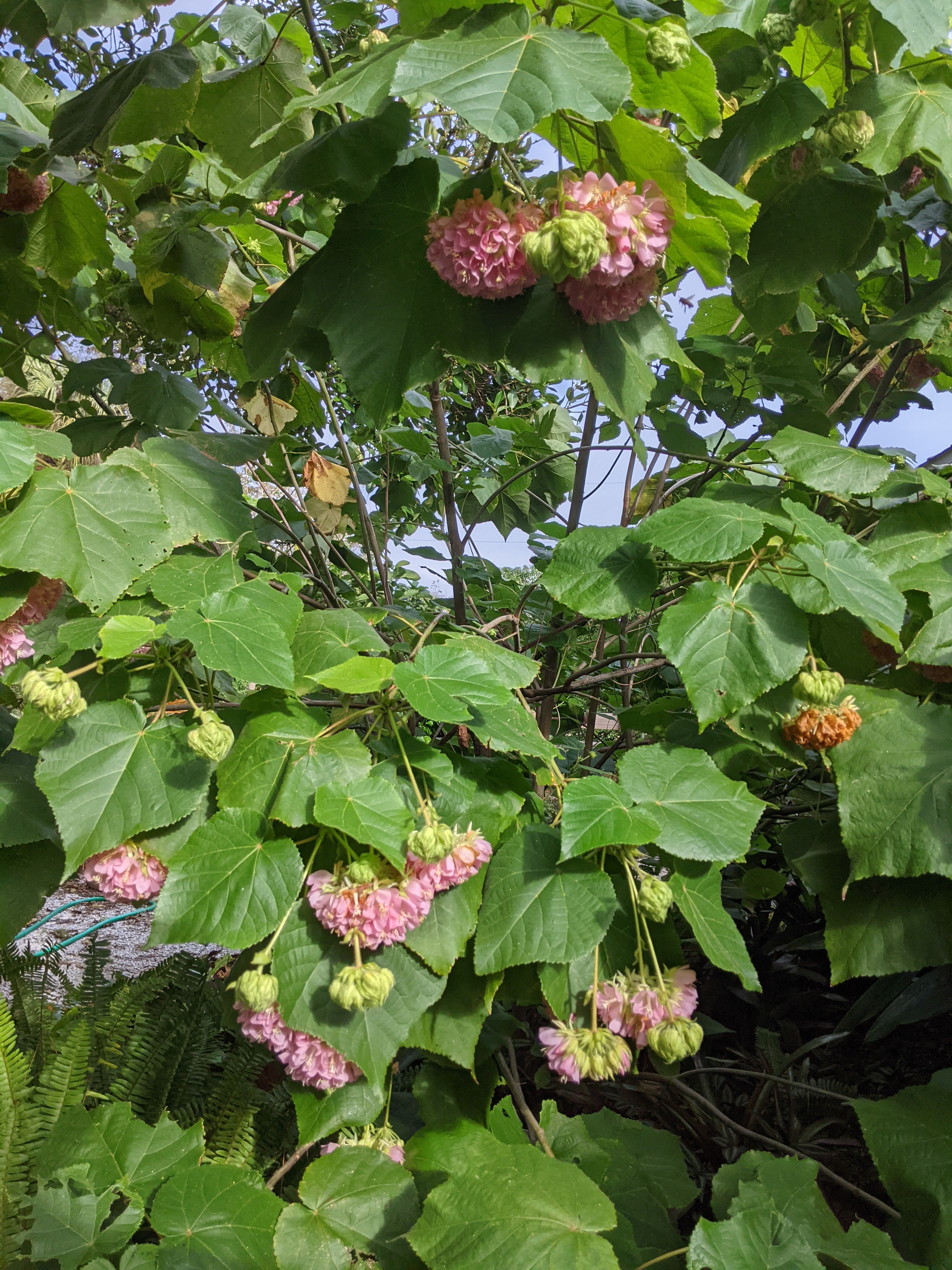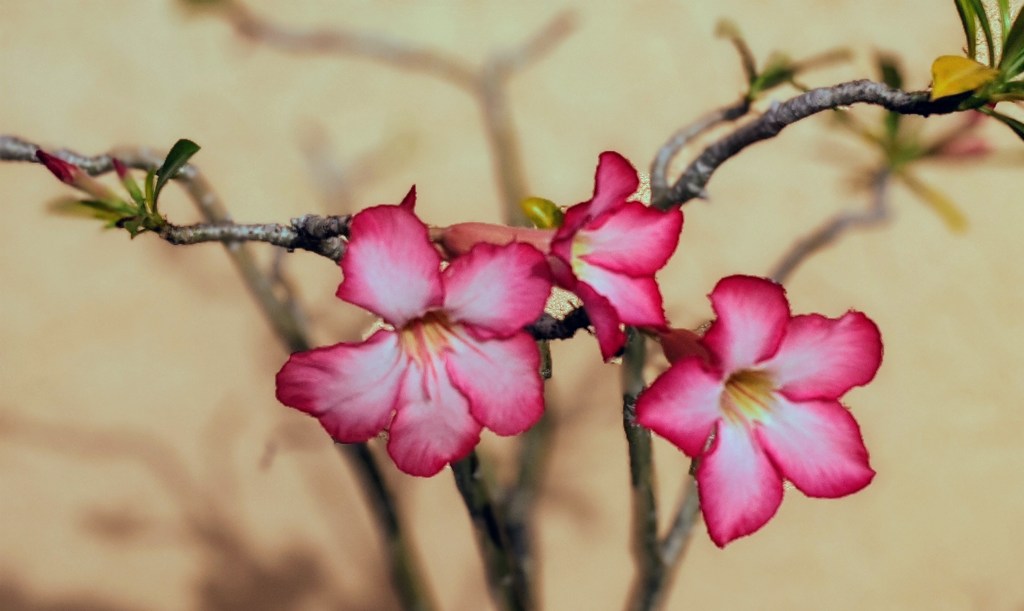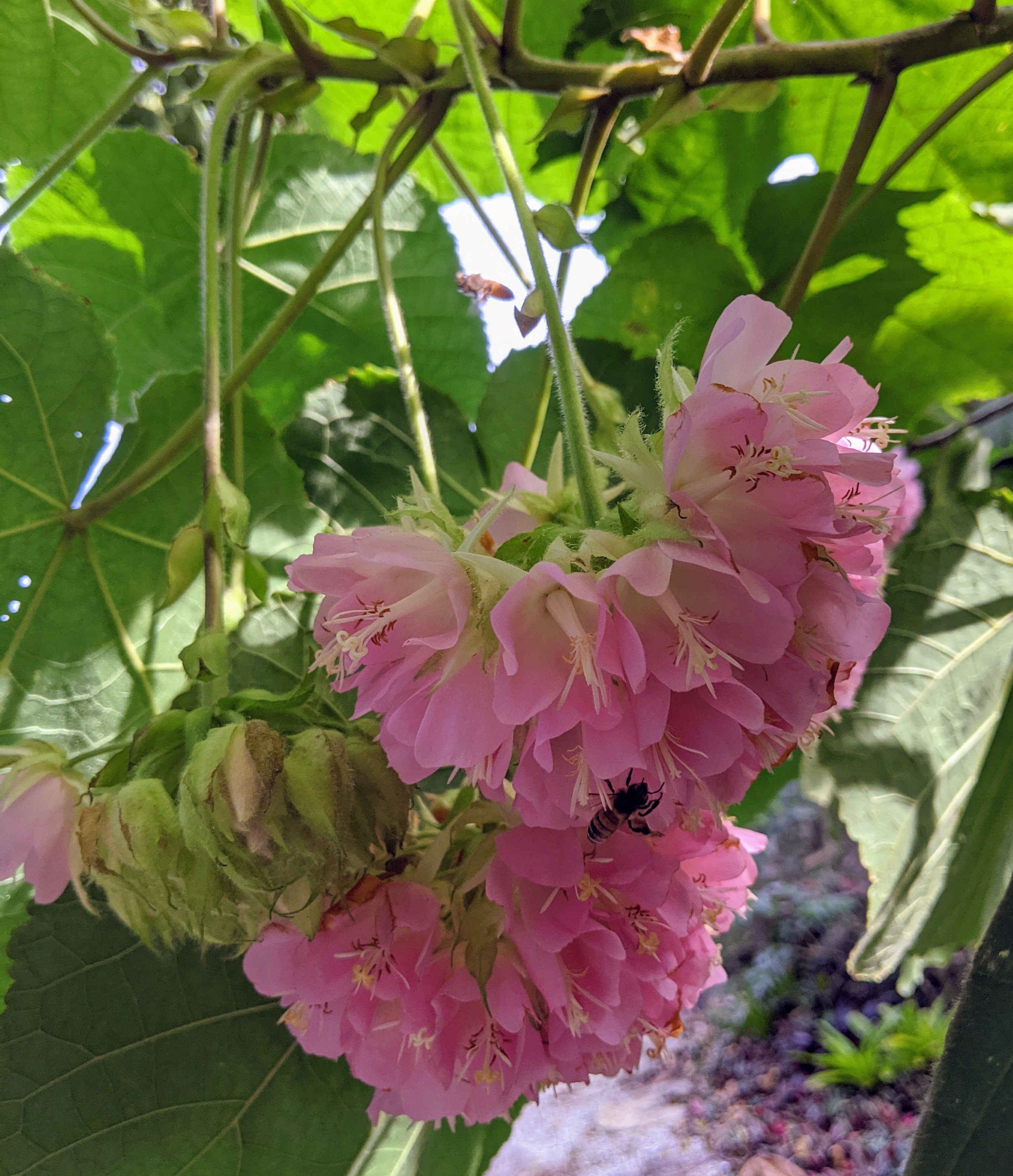 Red Nodding Hibiscus (Malvaviscus penduliflorus) are napping over the edge of the vase.