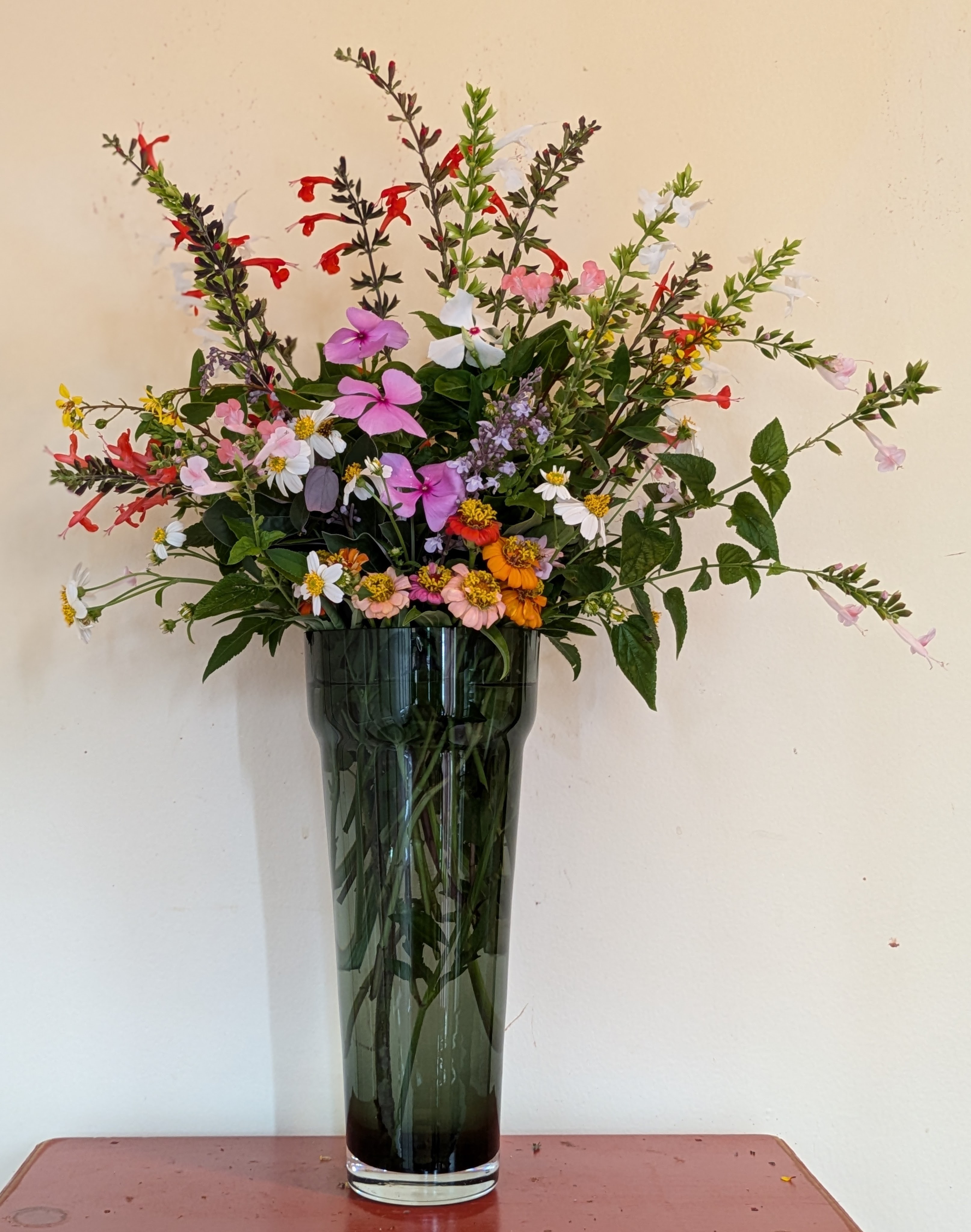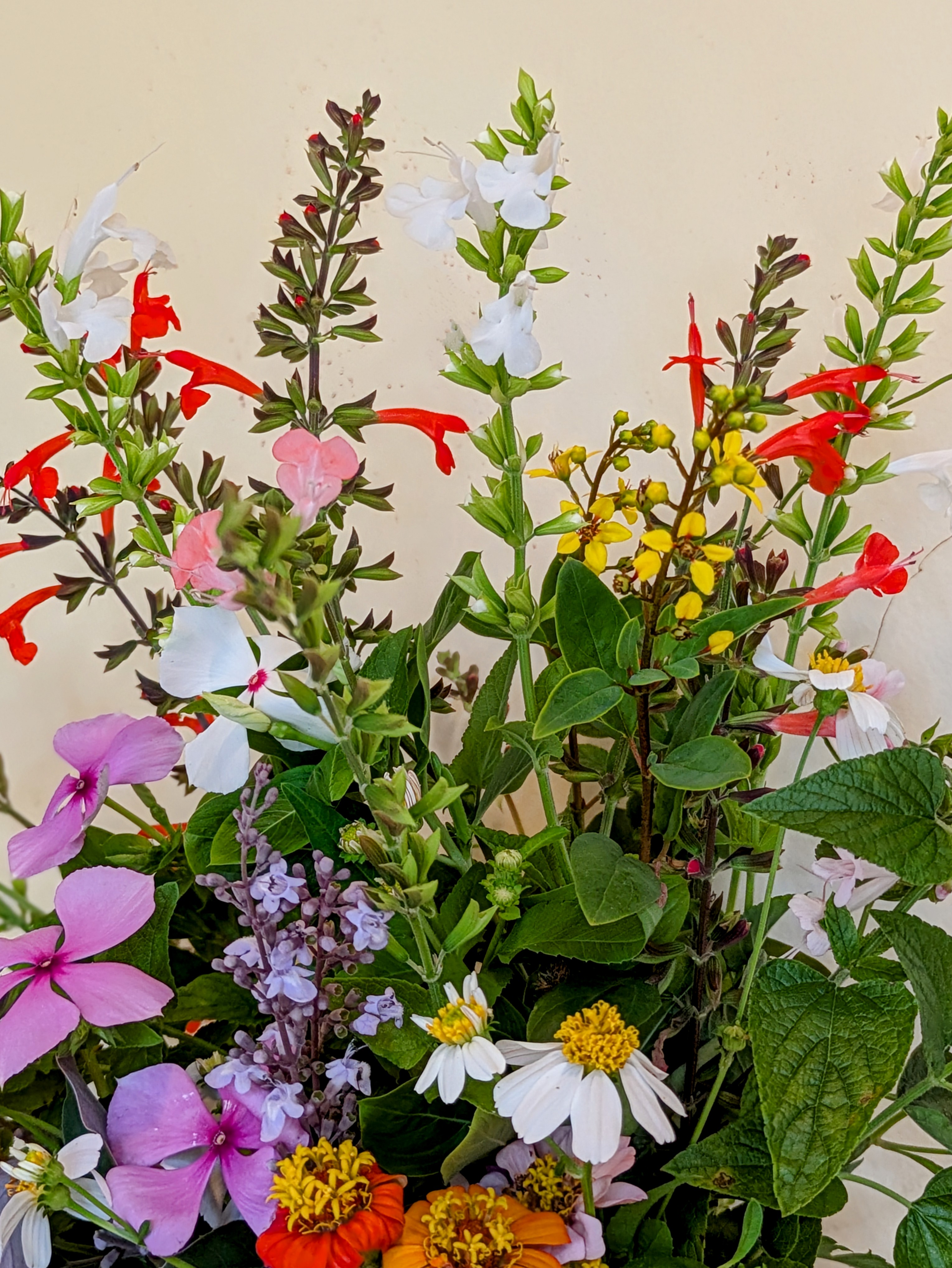 Yellow spikes are Thyrallis (Galpinia glauca); red, white and peach spikes are Tropical Red Salvia (Salvia coccinea). The vase is a thrift store find.