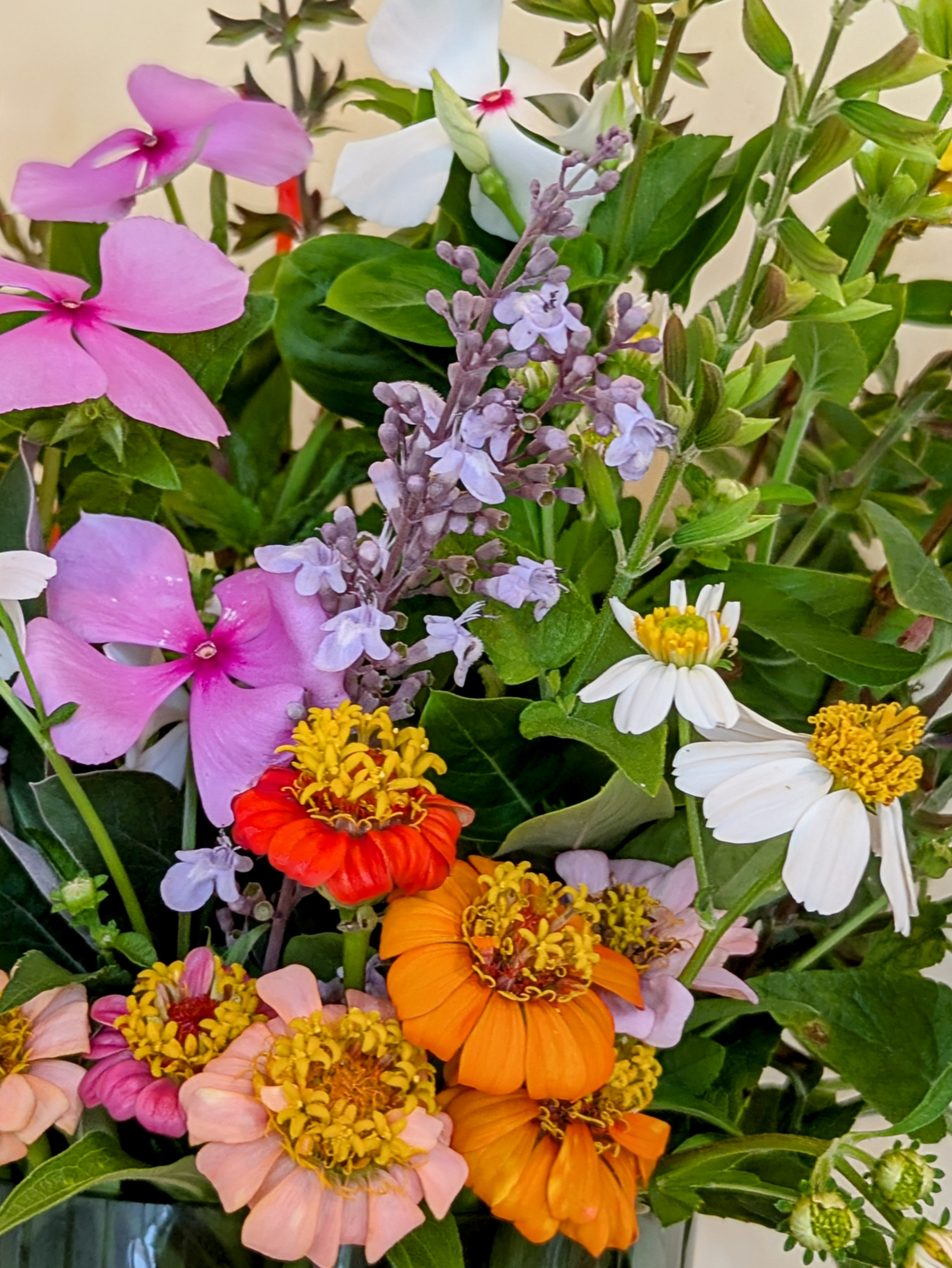 Multi colored flowers at bottom of image are ‘Zin Master’ Zinnias; white daisies are Bidens alba; purple spikes are Arabian Lilac (Vitex trifolia) ; pink and white flowers are Vinca (Vinca rosea).